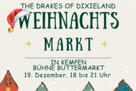 Wir freuen uns riesig, euch mitteilen zu dürfen, dass eine fantastische neue Sängerin aus Geldern den DRAKES beigetreten ist. Eva Welbers bringt mit ihrer einzigartig jazzigen Stimme frischen Wind in unseren Swing. Ihre Leidenschaft für Jazz und Swing und ihr unverwechselbarer Stil werden unser Repertoire auf ein neues Level heben. Unseren ersten gemeinsamen Auftritt hatten wir in kleiner Besetzung am 8.11.2024 auf dem „Lichtermarkt auf Haus Ingenray“. Wir haben die Atmosphäre dieser einmaligen Veranstaltung sehr genossen und laden Euch zu unserem dort entstandenen Video ein.Seid gespannt auf unser Debüt in voller Besetzung beim „Jazz for Christmas“ am 22.12.24. Kommt vorbei und freut euch auf Klassiker im neuen Glanz und in bester Swing-Manier und lasst euch von ihrer Stimme verzaubern!Die Stammbesetzung der Drakes in „voller Besetzung“Christof Schneichel an der TrompetePhillip Oerding Posaune und GesangWilfried Sieben Klarinette und GesangGünter Heenen am BassHubertus Kleinbielen am Banjo und der GitarreStef Geurts am Schlagzeug mit Eva Welbers (vocal)Die „kleine Besetzung“ der Drakes zur dezenteren Unterhaltung oder für einen swingenden musikalischen Background besteht aus EVAs Gesang mit der Gitarre, der Klarinette, der Posaune und dem Bass der Drakes. Wir nennen die Besetzung „Blue Swing Society“.